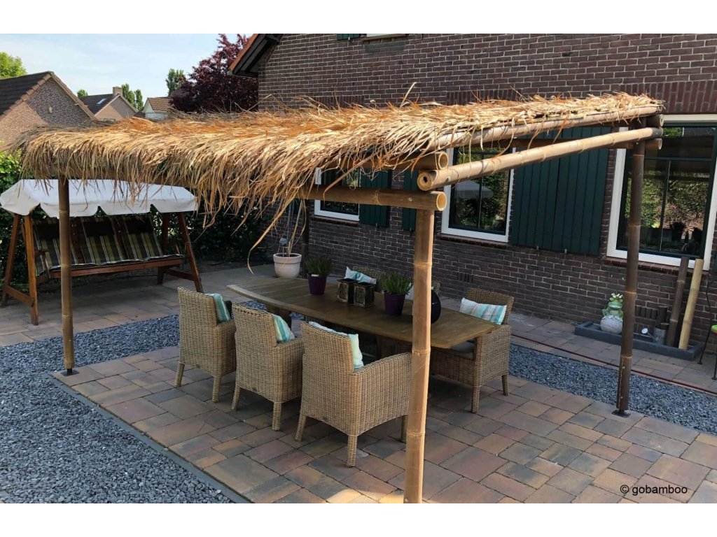 Rendelkezésre álló bambusz pergola készletünkkel bármilyen kertet, teraszt vagy rendezvényt gyorsan egzotikus környezetté varázsolhat. A bambuszból készült előregyártott pergolák könnyen összeszerelhetők, és egy speciális fúrószárral és minden szükséges tartozékkal érkeznek. A szabvány mérete 3 x 3 m, magassága pedig 3 m, de mivel a bambusz nagyon könnyen vágható, a mérete tetszés szerint választható. A bambusz oszlopok átmérője ebben a pergola készletben: Ø 5-7 cm (szarufa), Ø 8-9 cm (gerendák), Ø 8-9 cm (oszlopok).